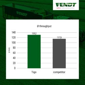 Maximale doorvoer is cruciaal voor hoge dagelijkse werksnelheden. Steeds kortere oogstvensters stellen dan ook hoge eisen aan mens en techniek. In de test overtuigde de Fendt Tigo met een gemiddelde opbrengst van 130 t FM/h bij maximale werksnelheid over meerdere testruns. De concurrerende machine haalde daarbij slechts 118 t FM/h. Ondanks 6% meer verdichting in de laadruimte is de doorvoer met de Tigo maar liefst 10,8% hoger.