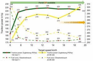 of concreet 233 Nm meer met 1.297 Nm (726) versus 1.065 Nm (6R 250)! Overigens: het topmodel John Deere 6R 250 vertoont een opvallend verschil ten opzichte van zijn voorganger, de John Deere 6250R, als gevolg van de wijziging in de emissienorm in 2022: 5% minder trekkracht en 3% meer brandstofverbruik!
